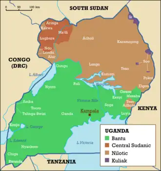 Численность населения 34 856 813[16][17][18] (перепись 2014 года). Население в 1931 году 3 557 534 жителя, в том числе европейцев 2 001 человек[19] Государственные языки: английский и суахили. Из африканских языков наиболее распространён луганда (племени ганда, используется как язык межнационального общения среди племён банту).