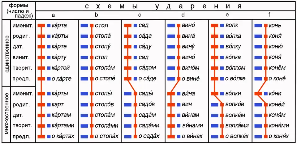 Основные схемы ударения в субстантивном склонении (по А. А. Зализняку)[18]