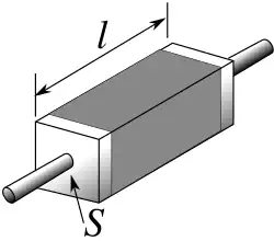Схема для пояснения определения удельного электрического сопротивления — брусок резистивного материала с электрическими выводами на обоих концах