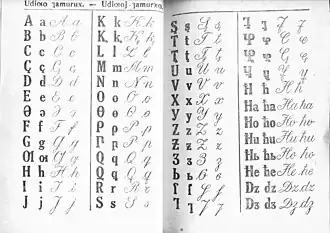 | Çъ çъ | Ć ć | Jı jı | Zı zı | Uъ uъ | Oъ oъ | İъ iъ | Dz dz |