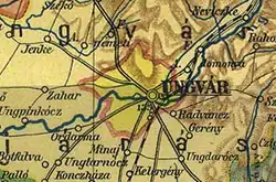 «Ужгород — или Унгоград, иначе Унгвар (чешско-словенско-русское U ž horod, Uhv à r, мадьярск. Unghv á r) — главный город Ужского (или Унгварского) комитата в Венгрии, на берегу реки Уж (или Уг). Около 12000 жит., преимущественно мадьярского племени (1965 словаков, 1651 немцев, 450 угрорусов); 3939 человек римско-католического, 3111 униатского, 999 евангелического и 3738 иудейского исповедания. Минеральные источники; гончарное производство; виноградники.»[10].