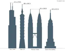 Башни-близнецы «Петронас» в Куала-Лумпуре высотой 452 м, включая декоративные шпили, после завершения своего строительства в 1998 году были объявлены самыми высокими зданиями в мире. С этим согласились не все: появились две категории определения самых высоких зданий. Башни-близнецы «Петронас» считались самыми высокими в одной из категорий. После окончания строительства здания Тайбэй 101 здания «Петронас» уступили первенство в высоте вместе со шпилем, а Уиллис-тауэр потерял первенство в высоте крыши. Тем не менее высота антенны Уиллис-тауэр в настоящий момент превосходит высоту шпиля Тайбэй 101 на 22 метра.