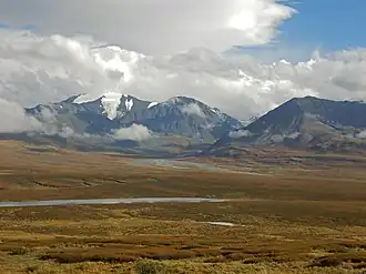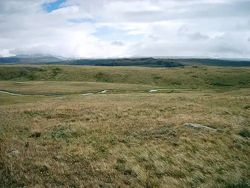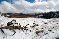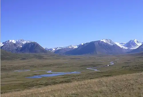 ![]() Долина реки Калгуты, вид на Табын-Богдо-Ола, плоскогорье Укок | |