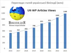По состоянию на октябрь 2022 года украинская Википедия находилась на 16 месте по количеству просмотров страниц среди всех языковых разделов Википедии — количество просмотров её страниц в составило 110 млн за месяц[7].
