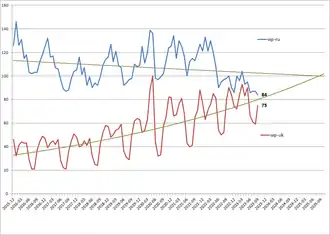 Верхняя (синяя) линия — число просмотров ру-вики с Украины. Нижняя (красная) линия число просмотров ук-вики с Украины.