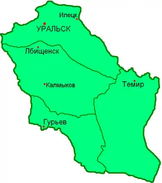 Уральская область образована указом Императора Александра II от 21 октября (2 ноября) 1868 года. Включала земли Уральского казачьего войска (с 1917 — Яицкое казачье войско) и часть области Оренбургских киргизов. Делилась на уезды: Гурьевский, Калмыковский, Эмбенский, Уральский. Входила в состав Оренбургского (1868—1881) и Степного генерал-губернаторств (1882—1917).
