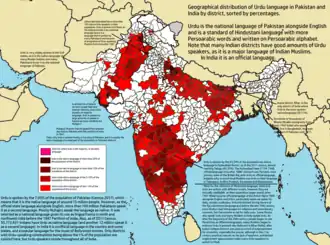 В Индии на урду говорит главным образом мусульманское население. Урдуязычные мусульманские общины имеются во многих районах на севере страны (штаты Кашмир, Уттар-Прадеш, Бихар, Махараштра, Мадхья-Прадеш, а также столица Дели), а также во всех крупных городах страны. Урду используется как язык преподавания в некоторых школах, изучается наряду с арабским языком в индийских медресе. В Индии насчитывается более 3000 периодических и непериодических изданий на урду, среди них 405 ежедневных газет. Урду — один из 22 официальных языков страны; кроме того, он имеет официальный статус в некоторых северных штатах страны). В Бангладеш на урду говорят так называемые «бихарцы»[19].