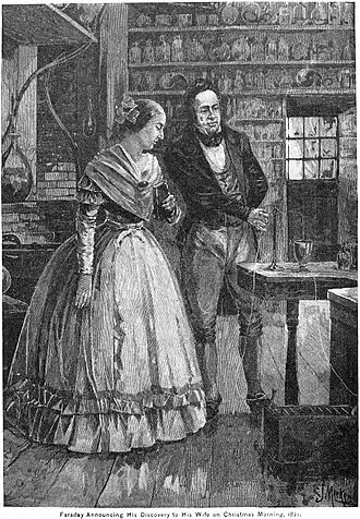 В 1821 году в жизни Фарадея произошло несколько важных событий. В июле он женился на 20-летней Саре Барнард (Sarah Barnard, 1800—1879)[комм. 1], сестре его друга. По отзывам современников и по заверениям самого Фарадея, брак был счастливым, Майкл и Сара прожили вместе 46 лет. Жили супруги на верхнем этаже Королевского института, за отсутствием собственных детей они воспитывали малолетнюю племянницу-сироту Джейн; Фарадей также постоянно заботился о своей матери Маргарет (умерла в 1838 году)[23][24]. В Институте Фарадей получил место технического смотрителя здания и лабораторий Королевского института (Superintendent of the House). Наконец, его экспериментальные исследования начали неуклонно перемещаться в область физики. Несколько значительных работ по физике, опубликованных в 1821 году, показали, что Фарадей вполне сложился как крупный учёный. Главное место среди них занимала статья об изобретении электродвигателя, с которой фактически начинается промышленная электротехника.