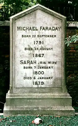 Майкл Фарадей умер 25 августа 1867 года за письменным столом, немного не дожив до 76-летия. Королева Виктория предложила похоронить учёного в Вестминстерском аббатстве, однако была исполнена воля самого Фарадея: скромные похороны и простой надгробный памятник в обычном месте. Могила учёного находится на Хайгейтском кладбище, участок для лиц не англиканского вероисповедания. Впрочем, воля королевы также была исполнена — в Вестминстерском аббатстве, рядом с могилой Ньютона, была установлена памятная табличка Майкла Фарадея[46].