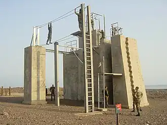 Упражнение по преодолению высотной полосы препятствий в Иностранном легионе Франции. Кроме физической подготовки, такая тренировка является элементом морально-психологической подготовки, помогающей в данном случае преодолеть боязнь высоты, Джибути, 2001