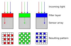Вследствие использования фильтров каждый фотоприемник воспринимает лишь 1/3 цветовой информации участка изображения, а 2/3 отсекается фильтром. Недостающие компоненты цвета рассчитываются процессором камеры путём интерполяции данных из соседних ячеек. Это называется демозаизацией. Таким образом, в формировании конечного цветового значения пикселя участвует 9 или более фотодиодов матрицы.