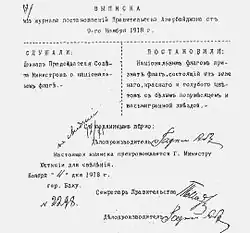 Окончательно переход азербайджанской письменности («тюрко-татарской» по тогдашней терминологии) на латинизированный алфавит был установлен постановлением ЦИК Азербайджанской ССР от 1 января 1929 года, в соответствии с которым из описания флага в статье 104 Конституции (Основного Закона) Азербайджанской ССР были убраны слова на «старом». С 1930 года на флаге Азербайджанской ССР изображалась аббревиатура «АССР» только на латинизированном алфавите. Это было закреплено в новой редакции Конституции (Основного Закона) Азербайджанской ССР, принятой 14 февраля 1931 года VII Всеазербайджанским съездом Советов[28].