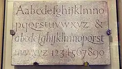 Буквы, вырезанные Эриком Гиллом для книги «Рукописные и надписные буквы для школ и классов и для использования ремесленниками» (Эдвард Джонстон, 1909)[1]. Позднее, автор передал их в Музей Виктории и Альберта, чтобы учащиеся Королевского колледжа искусств смогли воспользоваться образцами.
