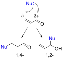 Присоединение нуклеофильных реагентов к α,β-ненасыщенным альдегидам может протекать как по карбонильной группе, так и по «четвёртому» положению сопряжённой системы. Причина этого заключается в том, что двойная углерод-углеродная связь поляризуется под действием полярной карбонильной группы (мезомерный эффект), и дальний от карбонильной группы атом углерода двойной связи приобретает частичный положительный заряд. Реакция нуклеофила с данным атомом углерода называется сопряжённым присоединением, или 1,4-присоединением. Присоединение к карбонильной группе по аналогии называют 1,2-присоединением. Формальным результатом 1,4-присоединения является присоединение нуклеофила по углерод-углеродной двойной связи. Во многих случаях 1,2- и 1,4-присоединение являются конкурирующими реакциями, однако иногда удаётся проводить селективные реакции с получением продуктов 1,2- либо 1,4-присоединения[35].
