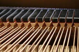Струны с помощью вирбелей (колков) натянуты на чугунной раме, проходя через дискантовый и басовый штеги, приклеенные к резонансной деке (в пианино дека находится в вертикальном положении, в роялях — в горизонтальном). Для 10-13 звуков нижнего регистра используется одна струна, для среднего и высокого регистров используется парный или тройной хор струн. Диапазон большинства фортепиано составляет 88 полутонов от ля субконтроктавы до до 5-й октавы. Более старые инструменты могут ограничиваться нотами до, ми, фа, соль, ля 4-й октавы; можно встретить инструменты и с более широким диапазоном.