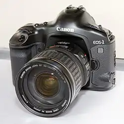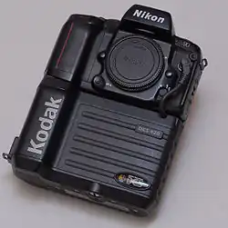 В том же году по заказу правительства США Kodak создал опытные образцы первого цифрового зеркального фотоаппарата Electro-Optic Camera на основе серийного малоформатного фотоаппарата Canon New F-1. Запись данных, полученных с матрицы, производилась портативным видеомагнитофоном[49]. Спустя три года Kodak выпускает первую серийную цифровую фотосистему Kodak DCS 100 на основе профессионального зеркального фотоаппарата Nikon F3[50]. Изображение записывалось на жёсткий диск, размещённый в отдельном блоке, носимом на плечевом ремне. Устройство стало дальнейшим развитием экспериментального фотоаппарата Hawkeye II, разрабатывавшегося по заказу военных[51]. Тогда же компания Leaf создала первый цифровой задник разрешением 4 мегапикселя для среднеформатных зеркальных фотоаппаратов[52].