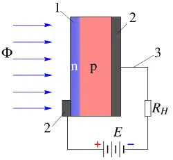 Структурная схема фотодиода. 1 — кристалл полупроводника; 2 — контакты; 3 — выводы; Φ поток электромагнитного излучения; Е — источник постоянного тока; RH нагрузка.