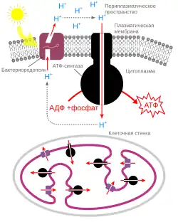1. Хромофор бактериородопсина ретиналь поглощает кванты света, что приводит к конформационным изменениям в структуре бактериородопсина и транспорту протона из цитоплазмы в периплазматическое пространство. Таким образом, в результате работы бактериородопсина энергия солнечного излучения трансформируется в энергию электрохимического градиента протонов на мембране.