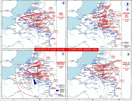 Французская кампания или Падение Франции (также: Шестинедельная война[23]) — военная операция стран Оси в Западной Европе с мая по июнь 1940 года, приведшая к разгрому французских, бельгийских и голландских вооружённых сил, а также эвакуации Британских экспедиционных сил из Франции и обеспечившая господство в Европе нацистской Германии и её союзников. План «Гельб» — кодовое название немецкого плана блицкрига против Бельгии, Нидерландов, Люксембурга; План «Рот» — против Франции.