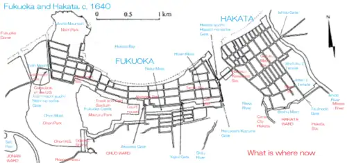 В 1601 году земли Хакаты достались роду Курода, и глава этого рода Курода Нагамаса построил на западе города замок. Он был назван «Фукуока», по имени родины предков Куроды в провинции Бидзэн[5]. Поскольку Хаката стала призамковым посёлком замка Фукуока и столицей княжества Фукуока, она была переименована в Фукуоку, хотя старое название «Хаката» оставалось в обращении до XIX века. В настоящее время Хаката-ку (яп. 博多区) - центральный деловой район города Фукуока.