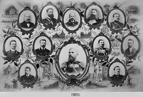 Члены Приамурского отдела Императорского Русского географического общества (ПОИРГО), 1901 год. Верхний ряд: К. Е. Пфаффиус, Н. Ф. Александров, М. С. Веденский, В. П. Маргаритов, А. Г. Лубенцов (слева направо). В центре И. П. Надаров. Второй ряд: Г. Ф. Белоусов, В. В. Перфильев, С. Н. Ванков, М. П. Щербина (слева направо). Нижний ряд: Р. К. Богданов и В. К. Бражников (слева направо).