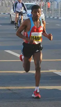 Ха́йле Гебресела́ссие (амх. ኃይሌ ገብረ ሥላሴ, транслит. haylē gebre silassē, англ. Haile Gebrselassie; 18 апреля 1973, Асэлла, провинция Арси, Эфиопия) — эфиопский стайер и марафонец. Двукратный олимпийский чемпион и четырёхкратный чемпион мира в беге на 10 000 метров, четырёхкратный чемпион мира в закрытых помещениях на дистанциях 1500 и 3000 метров. С 1994 года установил 27 мировых рекордов[5] на беговых дистанциях, начиная от 2000 метров и заканчивая марафоном[6]. В настоящее время владеет мировыми рекордами в беге на 20 000 метров и часовом беге[7].