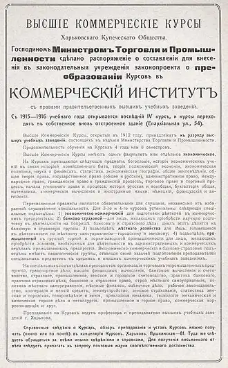 «Вчера в здании Харьковского коммерческого училища состоялось открытие Высших коммерческих курсов, имеющих в недалёком будущем быть преобразованными в Коммерческий институт».