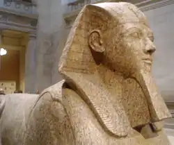 ![]() Известняковая сидячая статуя Хатшепсут в Метрополитен-музее, Нью-Йорк. Царица изображена без накладной бороды, но с символами власти фараона: головной убор немес, увенчанный царским уреем. | |
