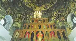 В зените свода изображен царь царей. На гранях свода изображены праздники. На сводах восьмерика и четверика, разделённых на шесть регистров — сюжеты христологического цикла, апокрифические легенды об иконе Римской богоматери и деяния апостолов. Два нижних пояса четверика забелены.