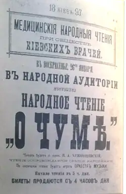 В отчёте Комиссии народных медицинских чтений при Обществе киевских врачей за 1887—1890 годы сообщалось о проведении чтений по охране здоровья, в частности эпидемиологии и гигиене. За период с 26 декабря 1886 года по 26 декабря 1890 года проведено 90 чтений. «Народные медицинские чтения везде и каждое воскресенье является обязательным разумным, практичным и дешёвым способом оздоровления России», — отметил Никанор Хржонщевский в этом же отчёте[29].