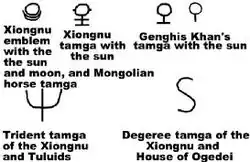 Современный символ монгольских народов соёмбо восходит к хуннскому символу с изображением солнца и луны (см. Флаг Монголии, Герб Монголии, Соёмбо, Флаг Бурятии, Герб Бурятии и Флаг Южной монгольской народной партии)[48][49].