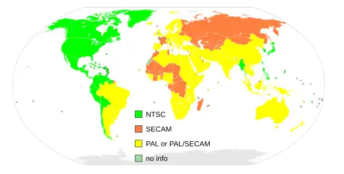 Здесь внедрение цветного телевидения происходило гораздо медленнее из-за послевоенной разрухи. Американский стандарт с нестабильной цветопередачей не находил поддержки у местных специалистов. Попытки модифицировать NTSC для вещания в Европе предпринимали французская компания RTF, английские EMI и BBC, а также голландский Philips, но в большинстве случаев результаты оказывались неудовлетворительными[53]. Разработка собственных систем затянулась до конца 1960-х годов, и регулярное цветное вещание не велось. Но к моменту принятия стандартов основные технологические проблемы производства приёмников и студийного оборудования уже были решены за океаном, поэтому распространение цветного телевидения в Европе происходило гораздо быстрее, хотя и позже. Большинство стран Западной Европы в 1966 году в качестве стандарта выбрало PAL, а Франция и страны СЭВ годом позже — SECAM[54]. Позднее система PAL начала использоваться в Азии, Австралии и ряде стран Африки, а SECAM — на Ближнем Востоке. К середине 1970-х чёрно-белое вещание было практически прекращено во всём мире. Дальнейшее развитие технологий выявило недостатки стандарта SECAM, от которого отказались в большинстве стран бывшего советского блока. В то же время PAL получил наиболее широкое распространение: в конце 1990-х годов передачи по этому стандарту смотрели в 62 странах 67,8 % телезрителей всего мира[55].