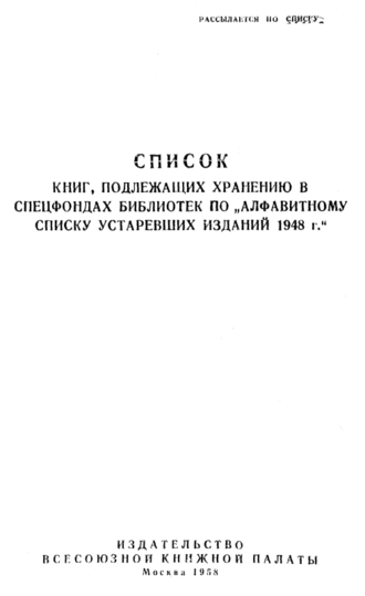 Обложка. Список книг, подлежащих хранению в спецфондах библиотек по «Алфавитному списку устаревших изданий 1948 г.»