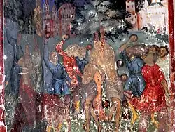 От ярославских образцов отличается фреска «Страшный суд» на западной стене. Кроме таких самобытных деталей, как змей, выползающий изо рта апокалиптического зверя, дьявол с зажатым в руках Иудой со вздыбленными волосами, муки блудниц и прочих, роспись церкви имеет колористические отличия от ярославской живописи (ярко-красный клубок огня в аду)[12].