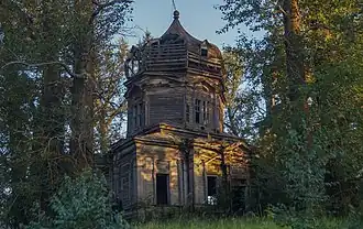 Деревянный храм стоит в центре села среди вековых деревьев. Церковь построена по традиционной трёхчастной схеме: храм с пятигранной апсидой и двумя прямоугольными приделами с юга и с севера, трапезная и трехъярусная колокольня. Храм «восьмерик на четверике» завершён широкой восьмигранной луковичной главой, увенчанной восьмиконечным крестом на подкрестном яблоке. Прямоугольная в плане трапезная покрыта на два ската. На квадратные в плане два нижних яруса колокольни установлен восьмигранный ярус — звон с четырьмя арочными проёмами, завершённый восьмигранным шатром. В храме под куполом сохранились росписи на библейские сюжеты, выполненные маслом по холсту. С запада и севера на фасадах сохранилась охристая краска. Само здание стоит на ленточной бутовой кладке из плитнякового известняка, перекрытия пола лежали на кирпичных столбах[4].