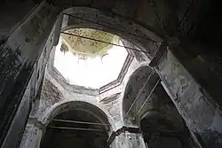 Основной объём церкви Спаса Преображения четырёхстолпный, имел пять глав с луковичными завершениями, одна из которых (наиболее сохранившаяся) обладает большим диаметром и является световой. У церкви крестовые своды, переход к барабану осуществляется через тромпы. Апсида квадратная, с тремя окнами. Южный и северный фасады обладают небольшими портиками.