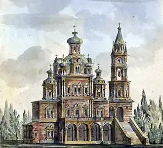 Храм представлял собой восьмерик на двухсветном четверике, завершённый главой на гранёном барабане, апсида и притвор — низкие односветные четверики, несущие световые восьмерики с главками на барабанах.