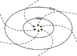 Движение воздуха (пунктирные стрелки) и изобары (непрерывные линии) в циклоне в северном полушарии