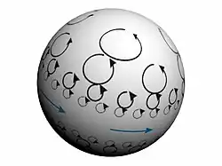 Схематическое изображение процесса образования циклонов (чёрные стрелки) из-за вращения Земли (синие стрелки)
