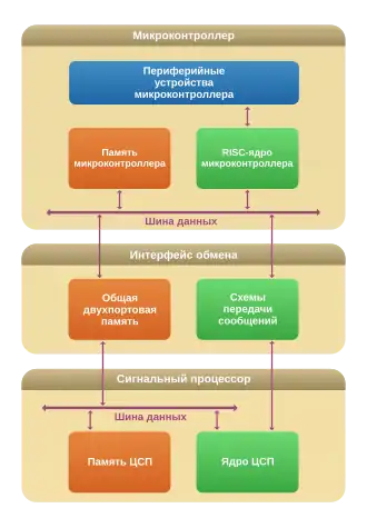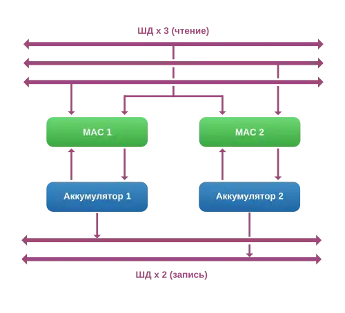 • две внутренние шины данных, что позволяет значительно ускорить парную обработку данных (координаты X/Y, действительная и мнимая часть и т. д.), либо виртуально удвоить разрядность обрабатываемых данных;