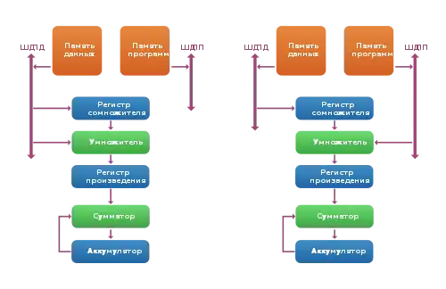 На рисунке показано два варианта выполнения команды MAC на стандартном ЦСП. В первом варианте оба операнда хранятся в памяти данных, поэтому на их выборку требуется два такта, то есть время выполнения n сложений равно 2n. Во втором случае один из операндов хранится в памяти программ, поэтому команда исполняется за один такт, и общее время выполнения цикла будет равно n тактов (в реальности для исполнения за один такт MAC должна исполняться внутри специальной команды цикла для исключения повторной выборки самого кода команды, что требует дополнительного такта). Эффективная реализация алгоритма требует использования памяти программ для хранения данных.