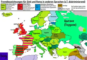 Англичане традиционно называли их Gypsies (от Egyptians — «египтяне»), испанцы — gitanos (также от Egiptanos — «египтяне»), французы — bohémiens («богемцы», «чехи»), gitans (искажённое исп. gitanos) или tsiganes (заимствование от греч. τσιγγάνοι, цинга́ни), немцы — Zigeuner, итальянцы — zingari, голландцы — zigeuners, венгры — cigány или fáraók népe («фараоново племя»), крымские татары — çingene, азербайджанцы — qaraçılar («чёрные»), грузины — ბოშები (бошеби), мингрелы — ჩაჩანეფი (чачанефи), армяне — Գնչուներ (гнчунер), боша, финны — mustalaiset («чёрные»), казахи — долы, сығандар, узбеки — люли, сигонлар, баски — erromintxela, ijitoak; албанцы — jevgjit («египтяне»); евреи — צוענים (цо’ани́м), от названия библейской провинции Цоан в Древнем Египте; персы — کولی (коли́); литовцы — čigonai; латыши — čigāni; болгары — цигани; эстонцы — mustlased (от эст. must — чёрный). В настоящее время всё большее распространение в различных языках получают этнонимы от самоназвания части цыган, рома́ (англ. Roma, чеш. Romové, фин. romanit и др.).