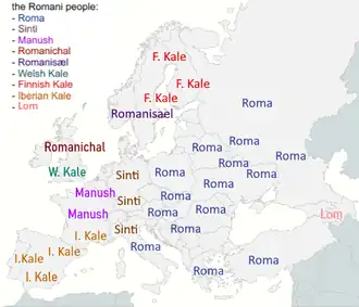 - кале́, самоназвание, ед. ч. кало — «чёрный»; языки преимущественно испанский и португальский; проживают в основном на Пиренейском полуострове, юге Франции, в Латинской Америке;