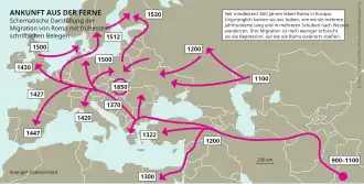 Предположительно, под натиском турок-османов в начале XV века цыгане мигрировали в Центральную и Западную Европу. Впервые они появились в Южной Чехии (1411), в Базеле и Гессене (1414), в Трансильвании и Молдавии (1417). Часть миграционного потока была направлена в Южную Германию (Регенсбург и Аугсбург — 1418), другая часть прошла через Прагу и Дрезден (1418) в Гамбург, Любек и Росток и направилась к Мецу и Страсбургу, Парижу (1427), мигрировала в Англию (1430) и Шотландию (1500). Другая часть прошла через Северную Италию к Риму (1422), часть — через Савойю и Южную Францию на территорию Испании (1425). Предположительно, цыгане мигрировали через территорию Европы и раньше, поскольку в Англии проживают сходные группы — тинкеры («лудильщики»). В начале XVI века цыгане мигрировали в Швецию и Великое княжество Литовское[1].