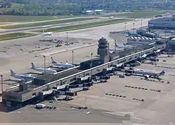 Международный аэропорт Цюриха расположен в городе Клотен, примерно в 10 км на северо-востоке от Цюриха. Это крупнейший аэропорт Швейцарии; в 2007 году Цюрихский аэропорт занимал 10-е место в Европе и 18-е в мире по объёму пассажиропотока (около 20 000 000 пассажиров за год)[23]. Он является основным узловым аэропортом авиакомпаний Swiss International Air Lines и Lufthansa и домашним аэропортом швейцарских авиакомпаний Belair, Edelweiss Air и Helvetic Airways. Аэропорт соединён скоростными поездами с Центральным вокзалом Цюриха и автобусами с районом Эрликон на севере города.