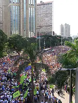 В 1999 году была принята новая конституция, и Чавес сфокусировался на проведении социальных реформ в рамках социалистической боливарианской революции. В период высоких цен на нефть в середине 2000-х годов[4] он национализировал предприятия ключевых промышленных отраслей, создал систему местного самоуправления и осуществил социальные программы, расширившие доступ населения к продовольствию, жилью, здравоохранению и образованию[5][6][7][8][9], и большей частью в 2003—2007 годах были достигнуты успехи в борьбе с бедностью, ликвидации неграмотности, уменьшении разрыва в доходах и улучшении качества жизни[4][10][11]. К концу правления Чавеса экономическая ситуация, на которой сказались предпринятые им ранее меры, в том числе контроль за ценами[12][13][14][15], и дефицит бюджета, стала нестабильной[16][17][18][19][20]: наблюдался спад, выросли уровень бедности[4][10][21] и инфляция[22], начался товарный дефицит. Значительно увеличился уровень убийств на душу населения[23][24][25]. Полицию обвиняли в коррупции[26]. Предоставление президенту чрезвычайных полномочий[27][28] и прославлявшая его пропагандистская кампания также подвергались критике[29][30][31].