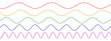 Частота волны (в видимом спектральном диапазоне) определяет её цвет: 4×1014 Гцкрасный цвет, 8×1014 Гцфиолетовый цвет; между ними в диапазоне (4...8)×1014 Гц лежат остальные цвета радуги. Электромагнитные волны, имеющие частоту менее 4×1014 Гц, невидимы для человеческого глаза, такие волны называются инфракрасным (ИК) излучением. Ниже по спектру лежит микроволновое излучение и радиоволны. Свет с частотой выше, чем 8×1014 Гц, также невидим для человеческого глаза; такие электромагнитные волны называются ультрафиолетовым (УФ) излучением. При увеличении частоты электромагнитная волна переходит в область, где расположено рентгеновское излучение, а при ещё более высоких частотах — в область гамма-излучения. Все эти волны, независимо от , принципиально одинаковы. В вакууме они распространяются со скоростью света.