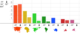| Континент | Длина (с востока на запад и с юга на север, по периферии), км | Доля суши | Население | Доля населения | Плотность населения |