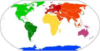 Принято выделять шесть частей света[1][2][3][4][5][7]: Австралию (или Австралия и Океания); Азию; Америку; Антарктиду; Африку; Европу.