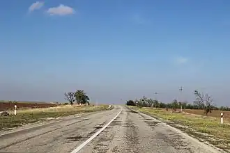 Дорога по степному Крыму очень прямая, от Евпатории проходит в северо-западном направлении, примерно на середине пути шоссе спускается к озеру Донузлав, который пересекает по «Аблямитскому мосту»[8], за которым, поворачивая на запад, поднимается на Тарханкутскую возвышенности, пересекает вдоль Тарханкут и, в конце, опускается к пгт Черноморское на берегу Чёрного моря[9].
